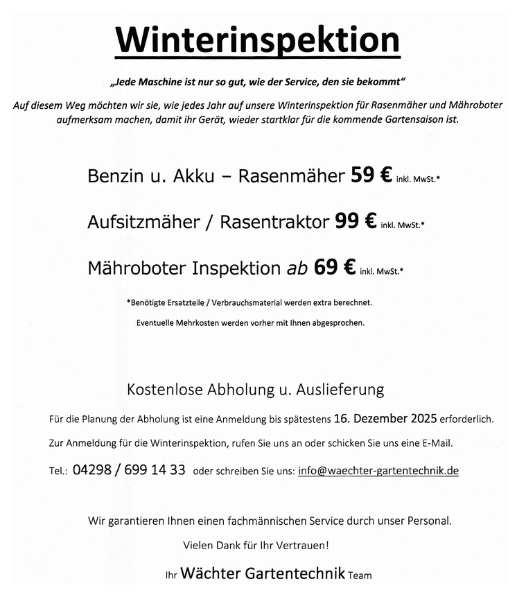 Neben einer ausführlichen Fachberatung, in der wir Sie über die Bedienung, Pflege und Handhabung der Mähmaschine aufklären, ist uns hochwertige und langlebige Qualität besonders wichtig.